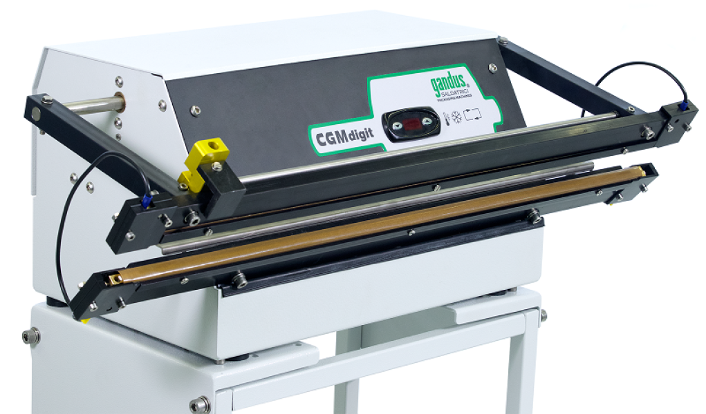 Thermoscelleuse à barre chauffante semi-automatique, compacte, de table, avec contrôle numérique des paramètres de scellage.